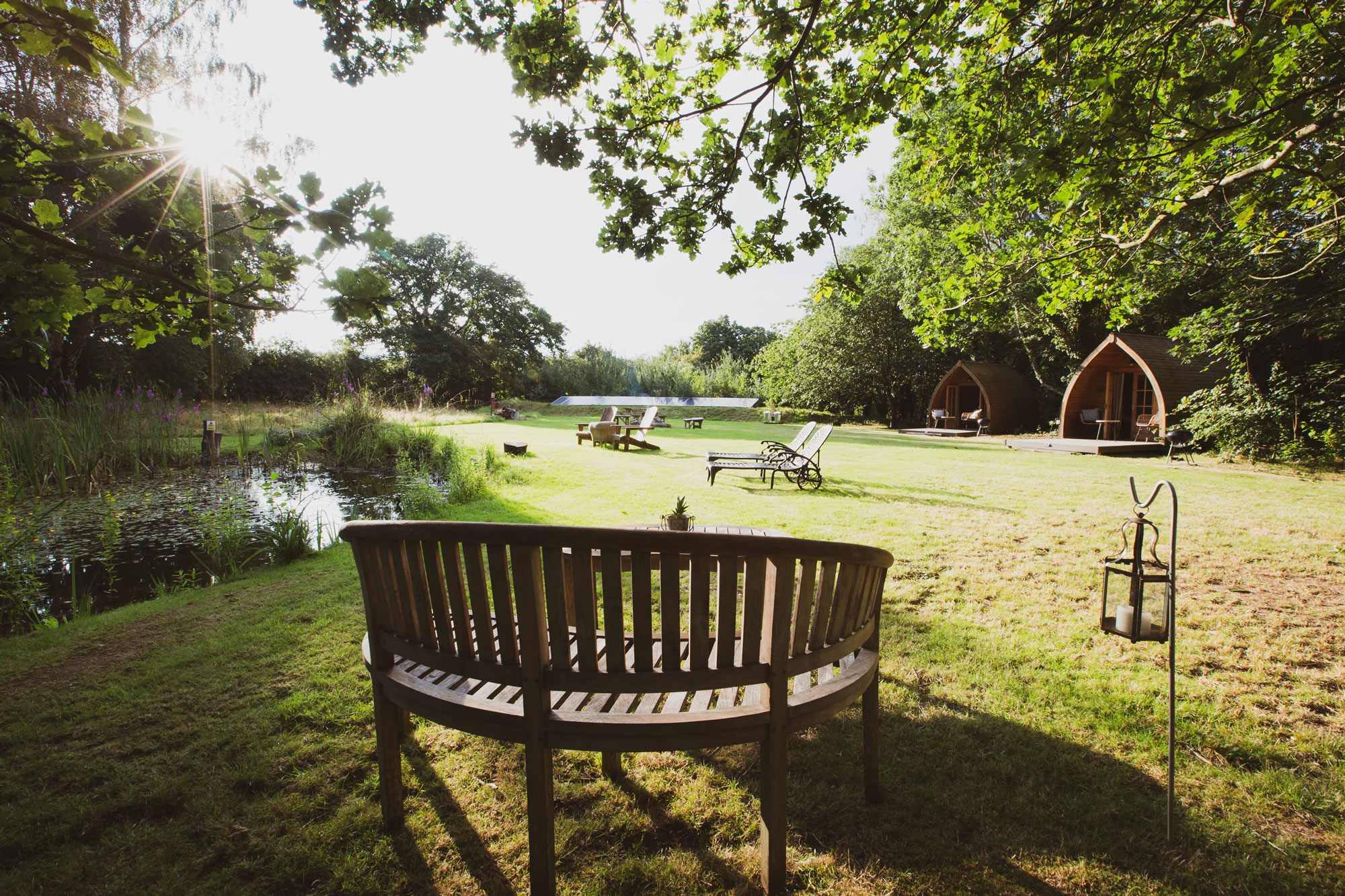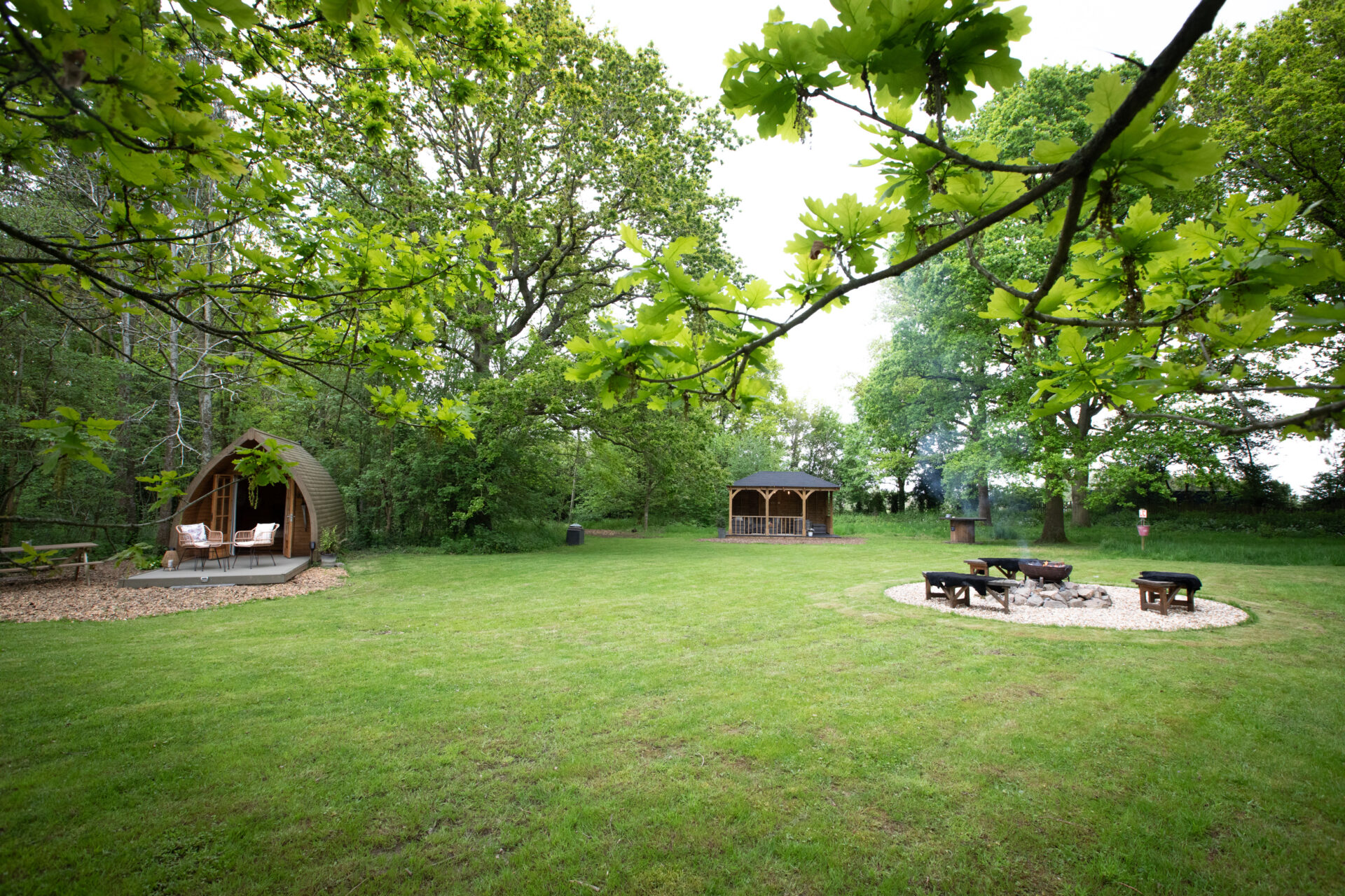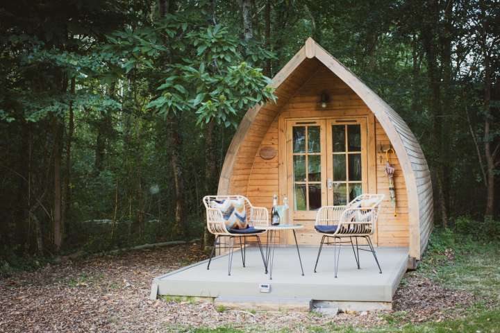 This beautiful, insulated, double glazed two berth pod sits on the edge of the woodland facing the meadow, oak trees and pond. Few bouncy steps along the wood chipped pathways will take you to the kitchenette/showers & toilets.
