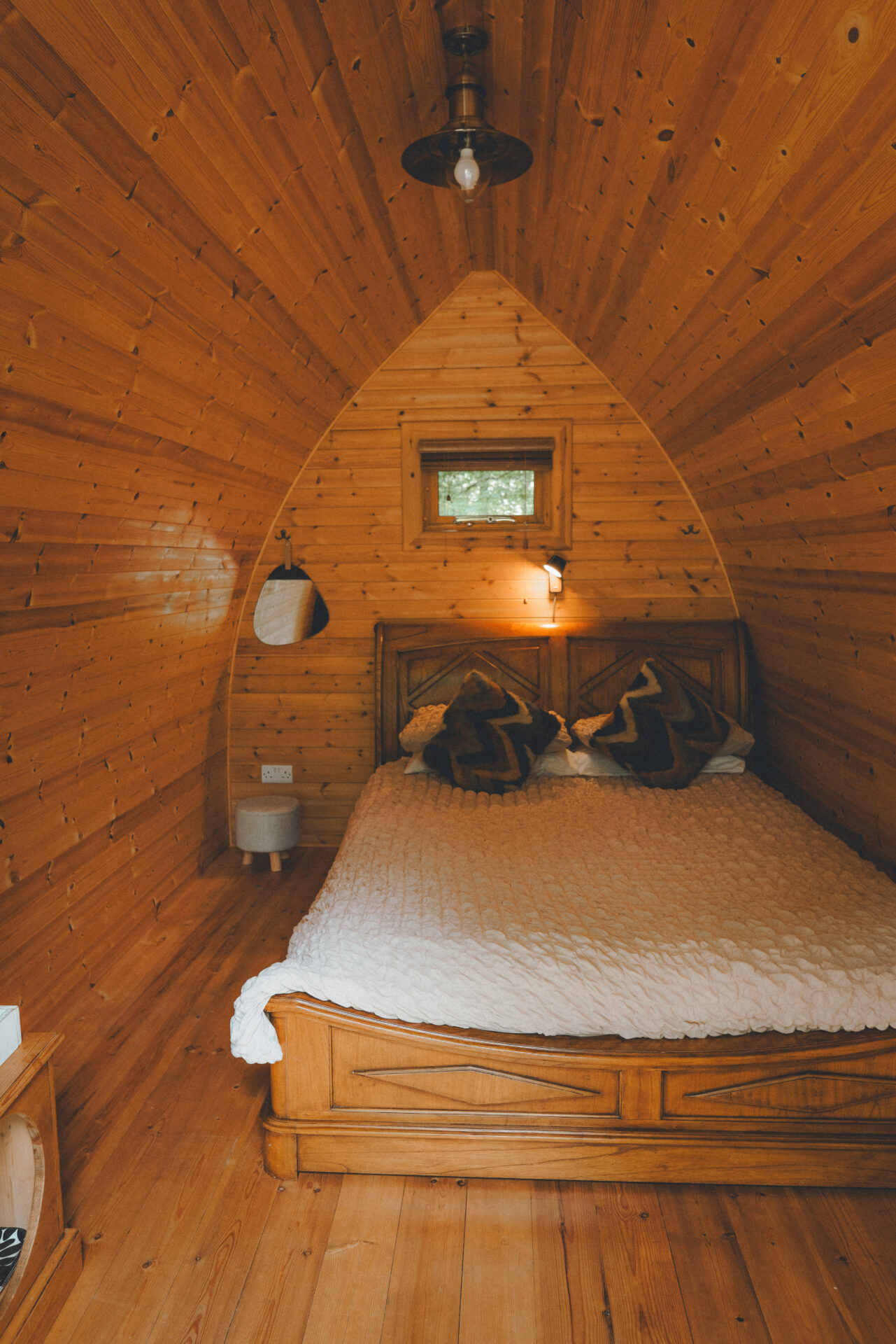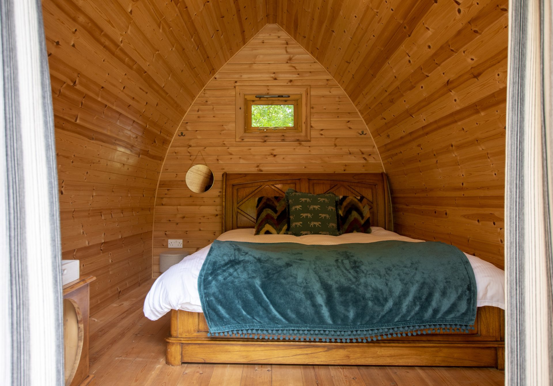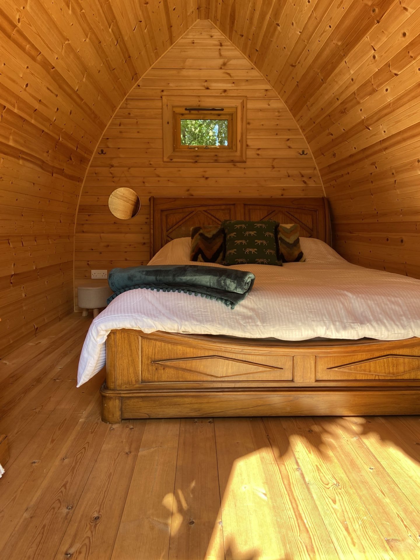 This beautiful, insulated, double glazed two berth pod sits on the edge of the woodland facing the meadow, oak trees and pond. Few bouncy steps along the wood chipped pathways will take you to the kitchenette/showers & toilets.