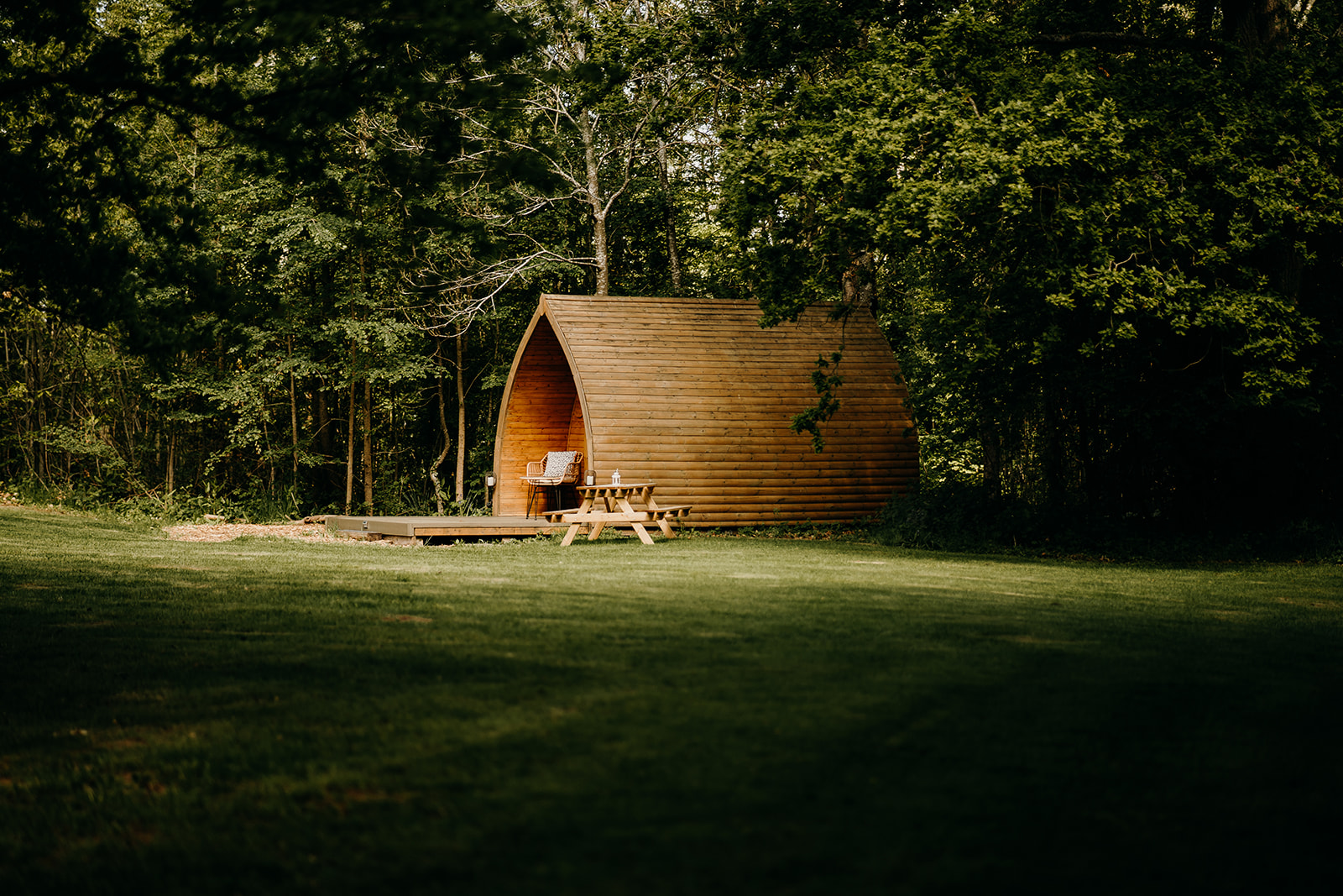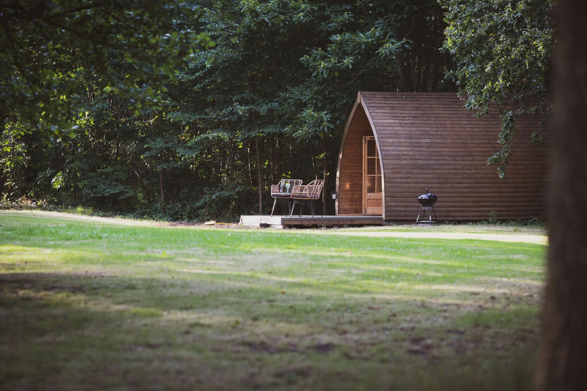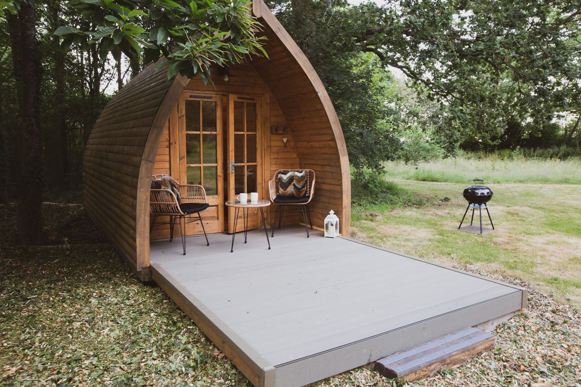 Complete with a super quiet fridge ready for your favourite tipple & snacks, kettle, 2 cups, electric & heating, freeview tv, fan, dimmable lighting & lighting to the front and rear of the pod. From the shelter of the wooden porch is a private decked area complete with 2 seats and small table. BBQ and utensils provided.